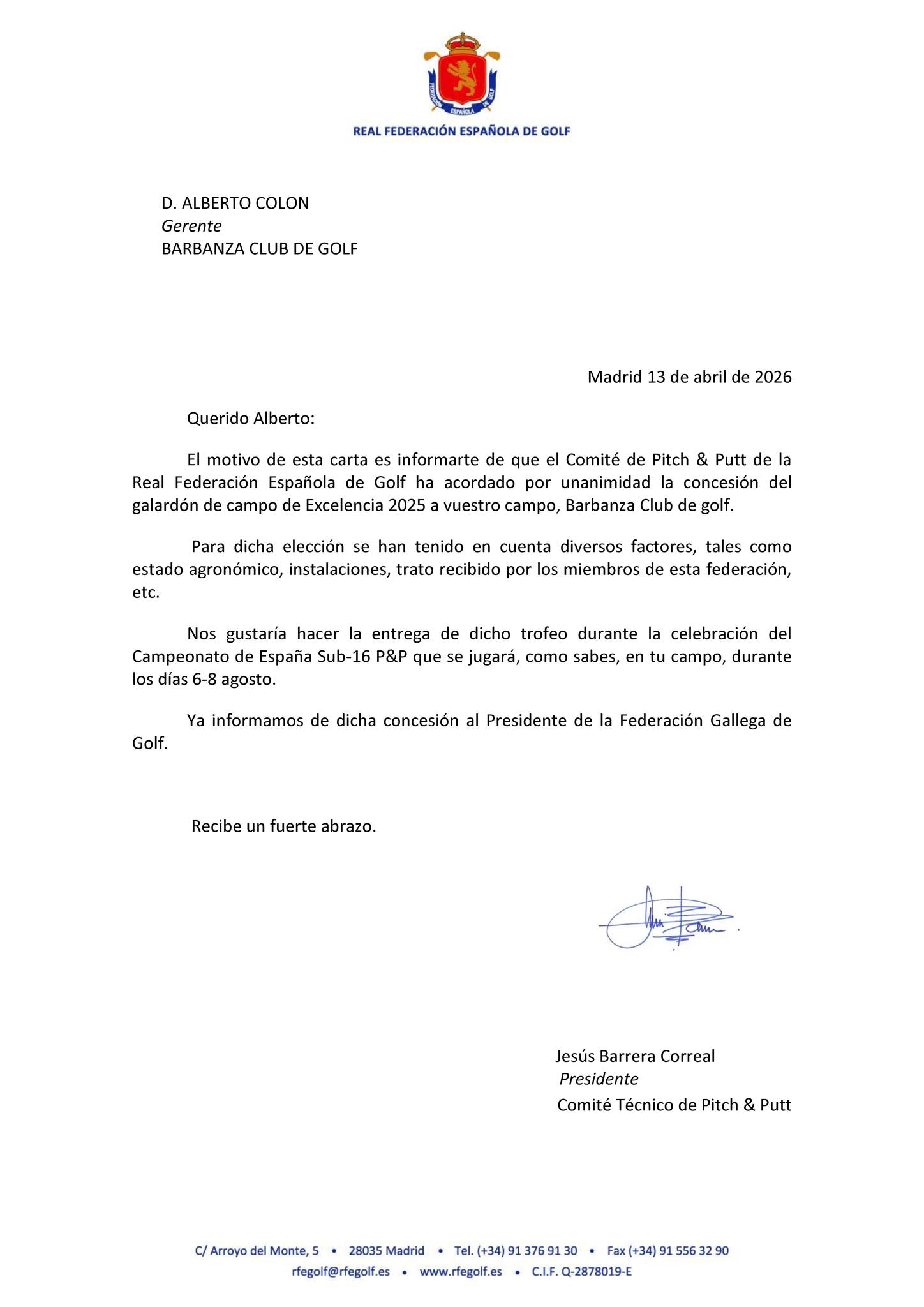 Nos gustaría compartir con tod@s vosotr@s la carta recién recibida de la Real Federación Española de Golf, estamos muy orgullosos a la vez que emocionados, esto no hace más que engrandecer la gran familia que forma este club.